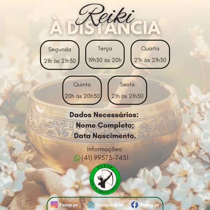 Você ou alguém que conhece está precisando de um tratamento terapêutico? A TUESP oferece emanação de Reiki de segunda a sexta! Você é nosso convidado! O Reiki é uma terapia integrativa e energética, reconhecida pelo SUS (Portaria Nº 849/2017), que atua na harmonização holística, tratando o corpo, as emoções, a mente e o espírito.